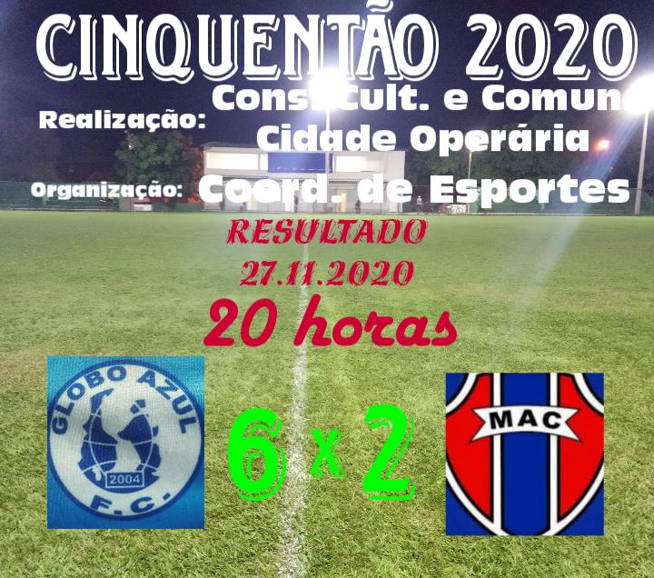 Em jogo isolado valido pelo Campeonato de Futebol Master Cinquentão promovido pelo Departamento de Esportes Amador do Conselho Cultural e Comunitario da Cidade Operária sob a coordenação do Francisco e Biné, nesta Sexta Feira (27) ás 20:00 a equipe do Globo Azul se mantem invicto na competição e fez mais uma vitima que passou em sua frente, dessa vez foi o Maranhão Atlético Clube Master vencendo pelo Placar de 6 x 2 num grande jogo onde a equipe do Globo Azul esta muito bem a caminho do titulo, o Maranhão não mostrou o que foi no inicio do Campeonato quanto venceu pelo placar de 8 x 2 a equipe do Gênios da 203, mais a equipe do Globo Azul que não esta nem ai segue o seu caminho atropelando todos que passam em sua frente, a sua proxima vitima fechando a primeira fase da competição é a equipe do Gênios da 203 no dia 13 de Dezembro ás 08:00